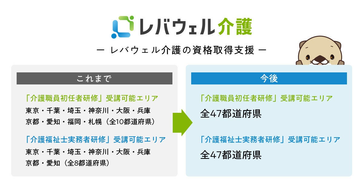 この度、加速する業界課題の進行によりスピーディーに対応し、これまで以上に多くの方々の資格取得を実現させていきたいと考え、これまで限定的であった対象エリアを全国47都道府県に拡大することにいたしました。また、エリアによって限定されていた取得可能資格の制限をなくすことで、全国で「介護職員初任者研修」「介護福祉士実務者研修」の取得が可能となります。これにより、「レバウェル介護」はこれまで以上に多くの介護業界で働く方々の資格取得支援を実現させ、業界における貢献範囲を拡大させて参ります。