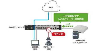 『SWX2220-10NT』『SWX2221P-10NT』はIEEE802.1X認証に対応し、強固なネットワークセキュリティーを実現します。さらに、ヤマハ無線LANアクセスポイントと連携する「LLDP自動設定機能」を使用することで、RADIUSサーバーと認証局を内蔵しているヤマハ無線LANアクセスポイントと接続するだけでRADIUSサーバー情報を自動的に登録することができ、複雑なセキュリティー設定を簡単に行えます。