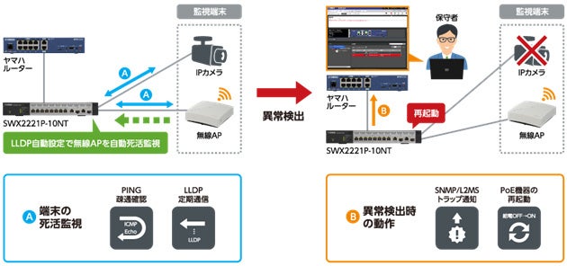 また、死活監視する機能を使用することで、ハングアップした無線LANアクセスポイントやIPカメラへのPoE給電を自動的にOFF/ONし、再起動できます。死活監視の方法は、PINGによる疎通確認だけでなく、端末からのLLDP定期通信の監視にも対応しています。監視する端末のIPアドレスを指定することなく、GUI上で死活監視したいポートをワンクリックするだけで設定が完了し、簡単にPoE受電機器の監視体制を構築できます。また、ヤマハ無線LANアクセスポイントと連携する「LLDP自動設定機能」を使用することで、接続されたヤマハ無線LANアクセスポイントを自動的に認識しLLDPによる死活監視を開始します。これにより、ヤマハ無線LANアクセスポイント追加時の設定業務の負荷を軽減できます。