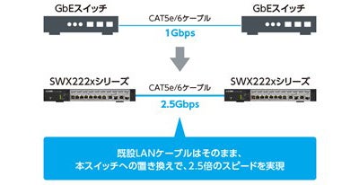 また、LANの高速化を低コストで実現します。『SWX2220-10NT』『SWX2221P-10NT』では、2.5ギガビット通信のために既設Cat5e/6ケーブルを利用できるため、LANケーブルの張り替え工事を行うことなく、従来の1ギガビット環境を2.5ギガビットの高速環境に置き換えることが可能です。さらに、アップリンクポートとして10ギガビット対応のポートを利用することで、複数の2.5ギガビット通信をボトルネックなく上位のネットワーク機器へ転送します。今後ますます必要な通信量が増えていく中、10ギガビットネットワークのフロア/アクセススイッチとして、長期間ご使用いただけます。