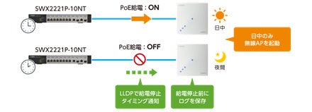 PoEスイッチ『SWX2221P-10NT』は、8個の2.5ギガビットポートで同時に30W給電が可能で、給電容量を気にすることなく、Wi-Fi 6対応無線LANアクセスポイントや高性能なIPカメラなどのPoE受電機器を最大8台収容できます。また、給電をスケジューリングできる機能や死活監視する機能など、PoE受電機器の運用を便利にするPoE給電制御に対応しています。給電のスケジューリング機能は、指定した時間帯だけPoE給電を有効にすることが可能です。例えば、オフィス業務の平日の就業時間のみ無線LANアクセスポイントへ給電することで、就業時間外の電力消費を削減し、無線LANの不正使用を未然に防ぎます。さらに、ヤマハ無線LANアクセスポイントと連携する「LLDP自動設定機能」を使用することで、給電停止タイミングをヤマハ無線LANアクセスポイントへ事前に通知することもできます。その際、ヤマハ無線LANアクセスポイントは、給電が停止される前にログを自動保存することで、ログ消失を防ぐことが可能です。