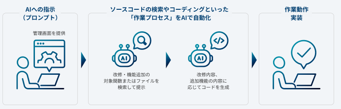 「コード解析支援AIソリューション」は、複数の大学との共同研究で得られた成果をもとに株式会社アキバ共和国(※1)が開発した「YAGOKORO」(※2)をロジックとして実装します。対象システムのソースコードを読み込むことにより、ソースコード内のファイルやプログラム同士の依存関係を解析し、システム全体を可視化します。自然言語による指示で、システムがどのような処理をしているのかを回答。改修や機能追加においては、対象ファイルや対象プログラムの提示、コードの生成まで行います。システム全体を理解したAIのサポートにより、対象システムへの理解や経験が少ないエンジニアでも高品質な運用が可能になります。COBOLをはじめとするレガシーシステムの運用現場などでの活用を想定しています。