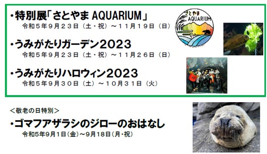 「持続可能な環境を考える」をテーマに、身近な里山を取り上げた特別展「さとやまAQUARIUM」や『うみがたり』のサステナビリティアクションの一環として昨年から取り組んでいる「うみがたりガーデン」を今年も実施するほか、9月30日(土)からはシーズナルイベントである「ハロウィン」企画がスタートします。また、9月18日の敬老の日にちなんで、国内飼育個体において最高齢のゴマフアザラシについて解説する「ゴマフアザラシのジローのおはなし」や65歳以上の方がお得に入館できる「シニア割」を実施します。