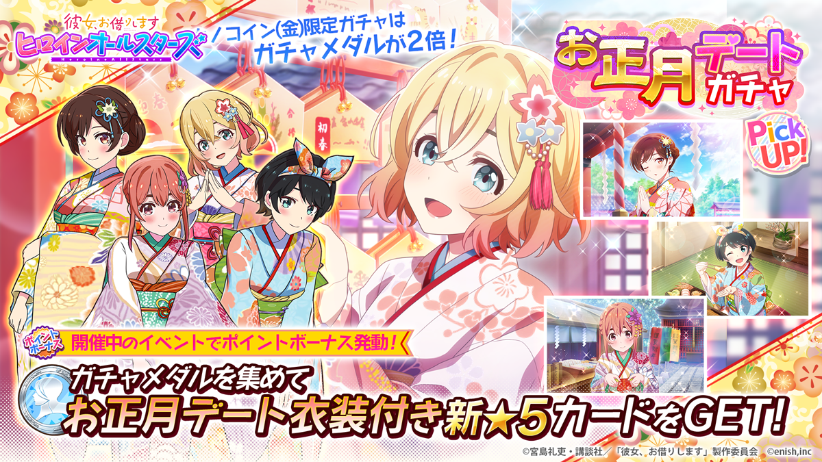 「彼女、お借りします」各ヒロインたちのオリジナルイラストとなる★5カードが登場するピックアップガチャです。「お正月デート★5確定ガチャチケ」等と交換できるガチャメダル付きです。
