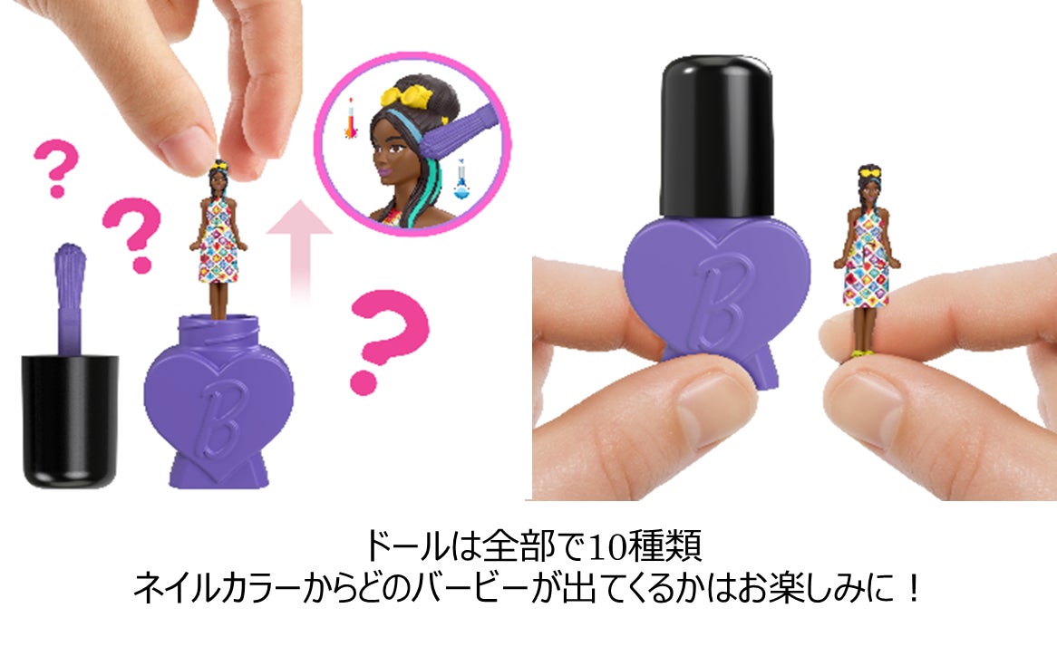 バービーのファッショニスタシリーズをモデルに作られた、マイクロドールがネイルカラーに入っている、遊び心満載でとてもキュートな商品です。ネイルカラーをあけると約3.81cmのバービーのマイクロドールが出てきます。種類はバービーとケンの全10種類。ドールにはハート型の台座がついており自立させたり、座らせたりできるので自分の好きな体勢で飾ることができます。水の温度で髪の一部が変化するしかけ付き。