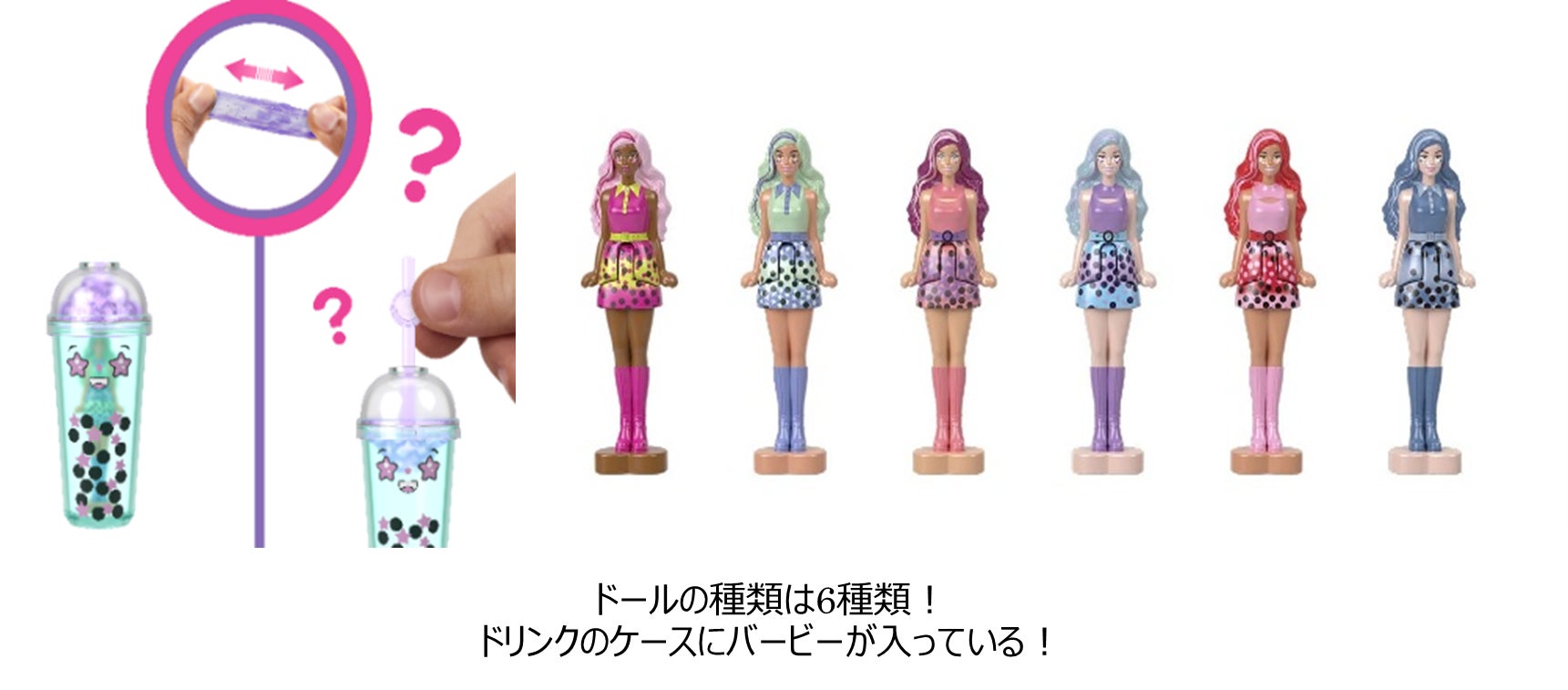 カラフルなドリンク型のケースから、約3.81cmのバービーが出てきます。バービーのポップリビールシリーズをモデルに作られたマイクロドールは、髪、肌、洋服の色や柄が異なる6種類、ドリンクの色は4種類あります。マドラーとスクイーズも付いています。
