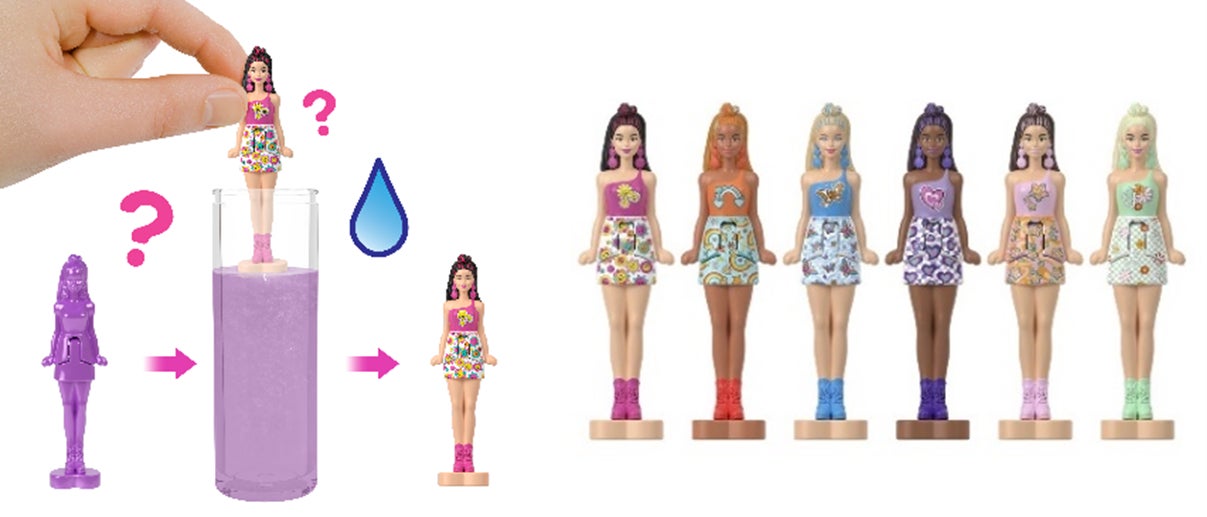 コーティングがついたマイクロドールを水に入れたケースに入れて振ると、約3.81cmのバービーが出てきます。バービーのカラーリビールシリーズをモデルに作られたマイクロドールは、髪、肌、洋服の色や柄が異なる6種類、水に入れてコーティングをはがすまで、どのバービーが出てくるかわからないサプライズトイ!