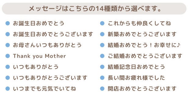 「とかげととかげのおかあさんのフラワーBOX」はラッピングをしてお届け。14種類のメッセージが選べるメッセージカード付きで、離れて暮らす方へ届けたい気持ちをのせて直送することもできます。