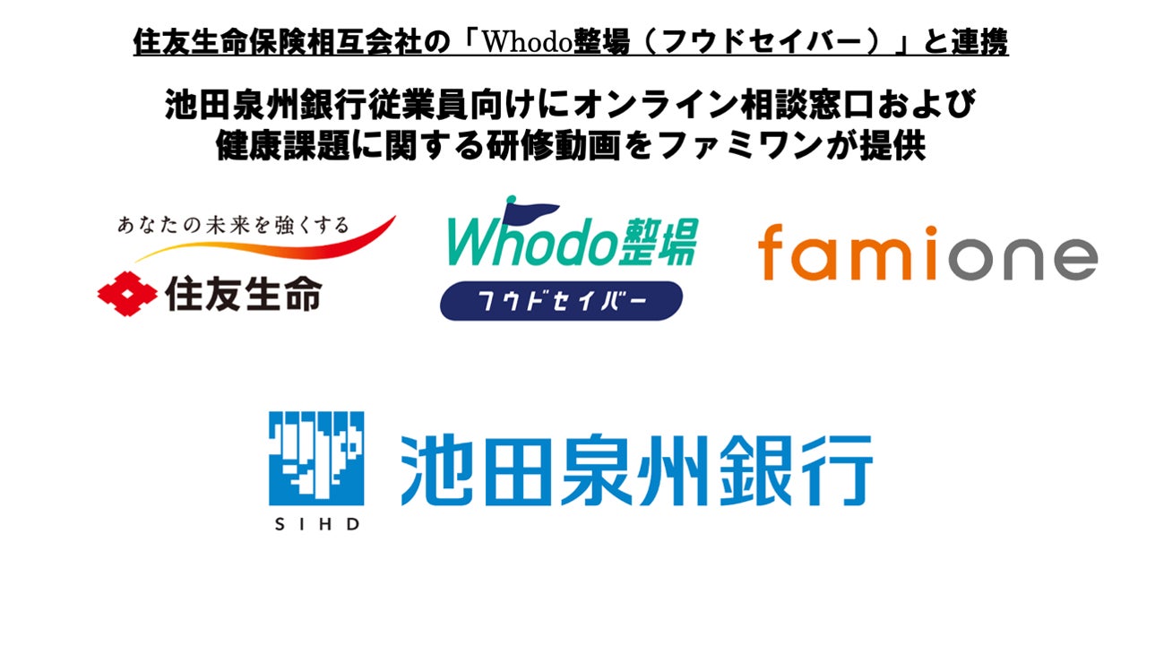 「子どもを願うすべての人によりそい 幸せな人生を歩める社会をつくる」をビジョンに掲げ、法人の従業員向け福利厚生や自治体の住民向け支援を行うヘルスケアサポートサービス「ファミワン」 https://famione.com/benefit/ などを展開する株式会社ファミワン(本社:東京都渋谷区、代表取締役:石川勇介)は、住友生命保険相互会社(本社:大阪府大阪市、取締役 代表執行役社長:高田 幸徳)の不妊治療と仕事の両立支援ソリューション「Whodo 整場(フウドセイバー)」を介し、株式会社池田泉州銀行(代表取締役頭取兼CEO:鵜川淳、以下「池田泉州銀行」)の従業員向けにオンライン相談窓口及び従業員向けの研修動画を提供します。