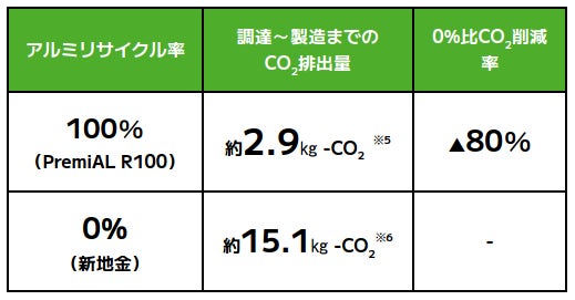 「PremiAL R100」は、原材料の100%にアルミリサイクル材を使用した循環型低炭素アルミ形材です。第三者認証の「【エコリーフ】環境ラベル」(※4)取得により、建設時に使用する建材の環境への影響を定量的に示すことを可能とし、低炭素建材を使用した建築物の環境価値の向上に貢献します。「PremiAL R100」1㎏あたりの原材料調達・輸送・製造までのCO₂排出量は2.9㎏で、新地金を100%使用したアルミ形材と比較すると、80%のCO₂排出削減に貢献します。