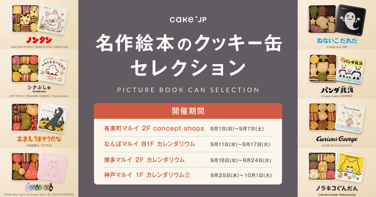 ケーキ・スイーツ専門通販サイト「Cake.jp(ケーキジェーピー)」を運営する株式会社Cake.jp(本社:東京都新宿区、代表取締役:高橋 優貴)は、9月1日(日)から10月1日(火)の31日間、東京・大阪・兵庫・福岡の4都府県のマルイにてCake.jpと人気絵本がコラボしたオリジナルクッキー缶を購入いただけるポップアップストア「名作絵本のクッキー缶セレクション by Cake.jp」を期間限定で順次出店します。