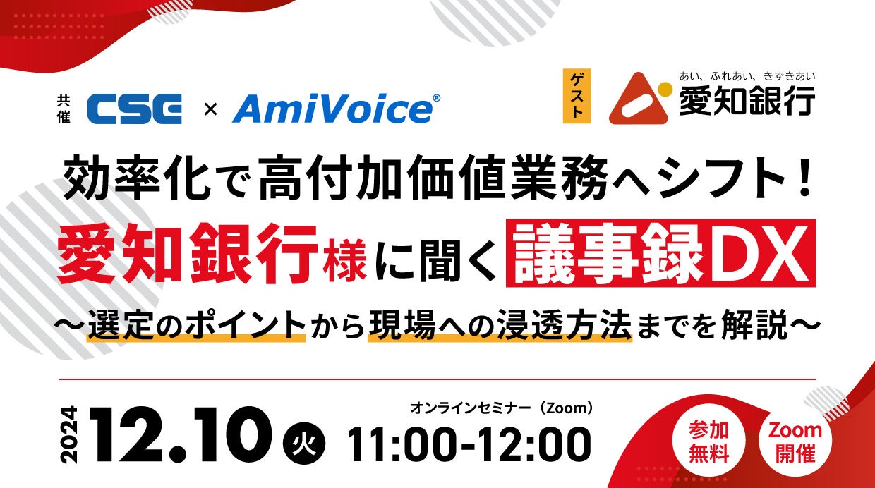 2024年12月10日(火)、株式会社アドバンスト・メディア(本社:東京都豊島区、代表取締役会長兼社長:鈴木清幸 以下、アドバンスト・メディア)は、オンラインセミナー「効率化で高付加価値業務へシフト!愛知銀行様に聞く議事録DX~選定のポイントから現場への浸透方法までを解説~」を開催いたします。