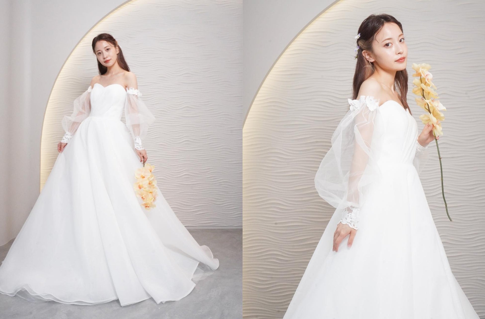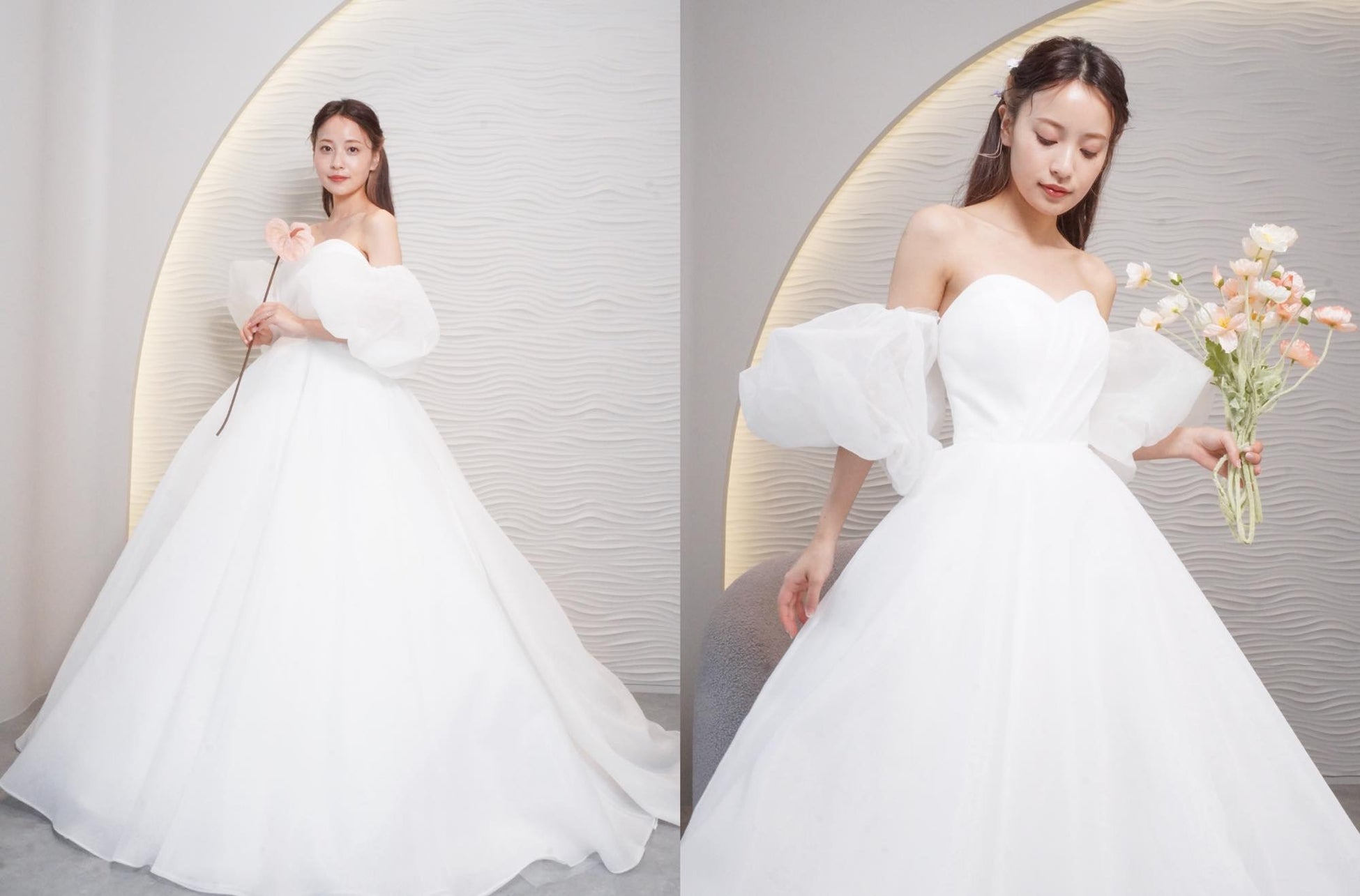 オーガンジーのドレスに、大きなパフスリーブを組み合わせました。トレンド感もありながら、誰でも着やすいデザインのドレスです。