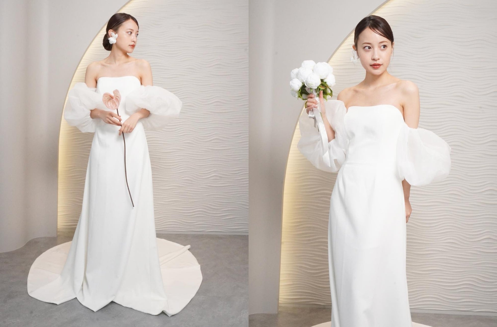トレンドのパフスリーブを、スレンダーラインのドレスに組み合わせて、おしゃれで洗練された印象に仕上げました。