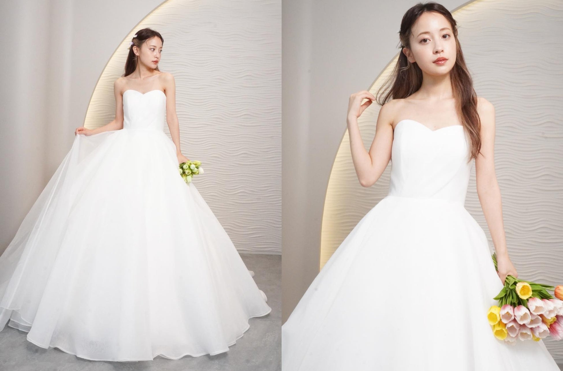 シンプルなオーガンジーのドレス。お客様の声をもとに、ビスチェのカットラインや、スカートのボリューム感にこだわって作っています。トレーンもしっかり長さががあり、後ろ姿も華やか。専用パニべが付属しています。