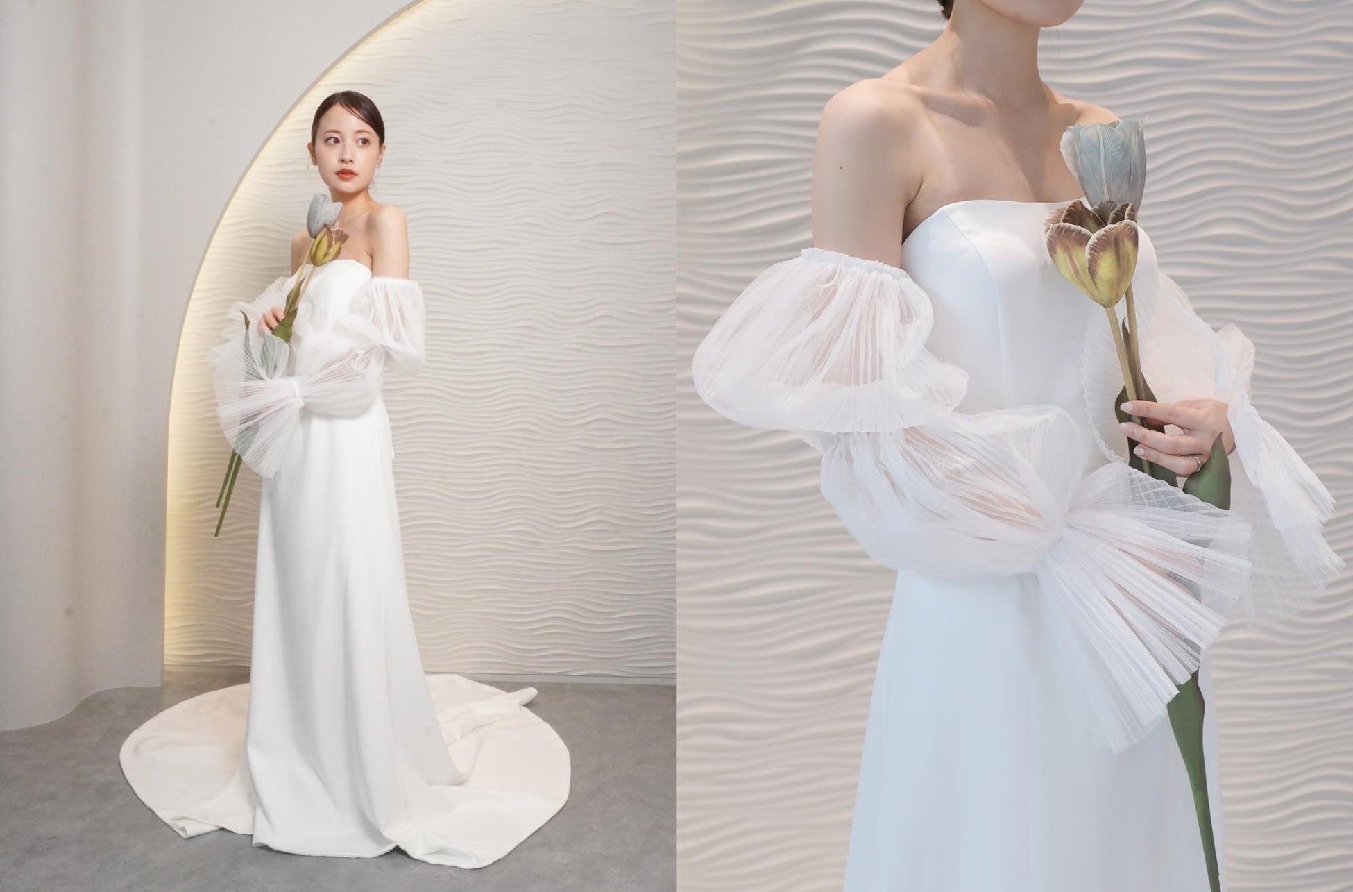 ふんわりとしたチュールのお袖がかわいいドレス。「美」や「喜び」の象徴とされているちょうちょがレースになり、袖口や肩にとまっているようなデザインです。