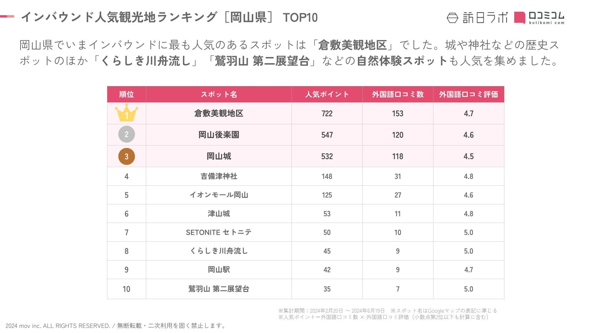 <インバウンド人気観光スポットランキング[岡山県編] TOP10>