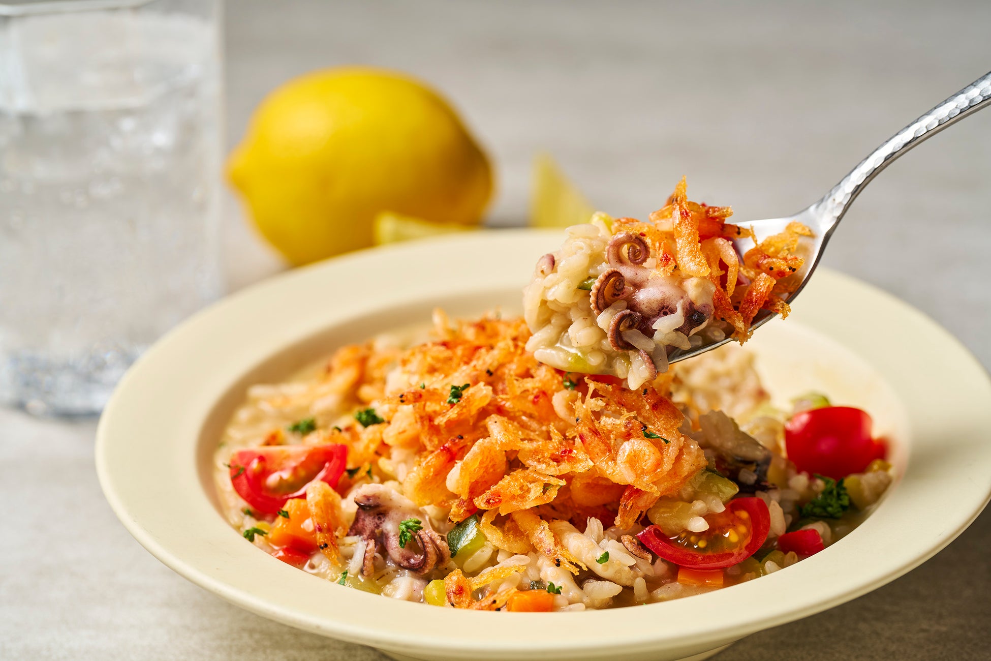 ゴロッとしたイイダコと数種類の野菜で炊き上げたリゾットに爽やかなレモンオイルを合わせました。サクサクの桜エビの香りと共にお楽しみください。
