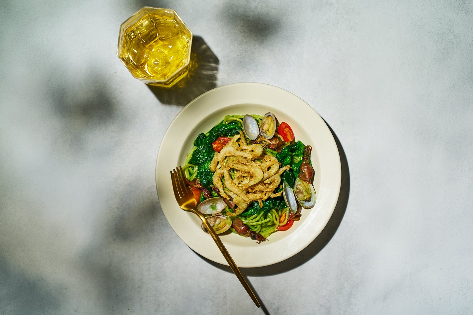 旬の食材をやさしく重ねました。季節が変わるこの時期に、気分を明るくする一皿です。こんがりと香ばしく焼き上げた鯛のアラは、店内でじっくり圧力鍋をかけ、旨みを引き出した出汁に。そのベースに、ホタルイカやあさり、ほろ苦い菜の花を混ぜ合わせて、彩りたっぷりの春ならではの味わいに仕上げています。鯛だしに菜の花のペーストを混ぜた、あなたがまだ知らないジェノベーゼ。