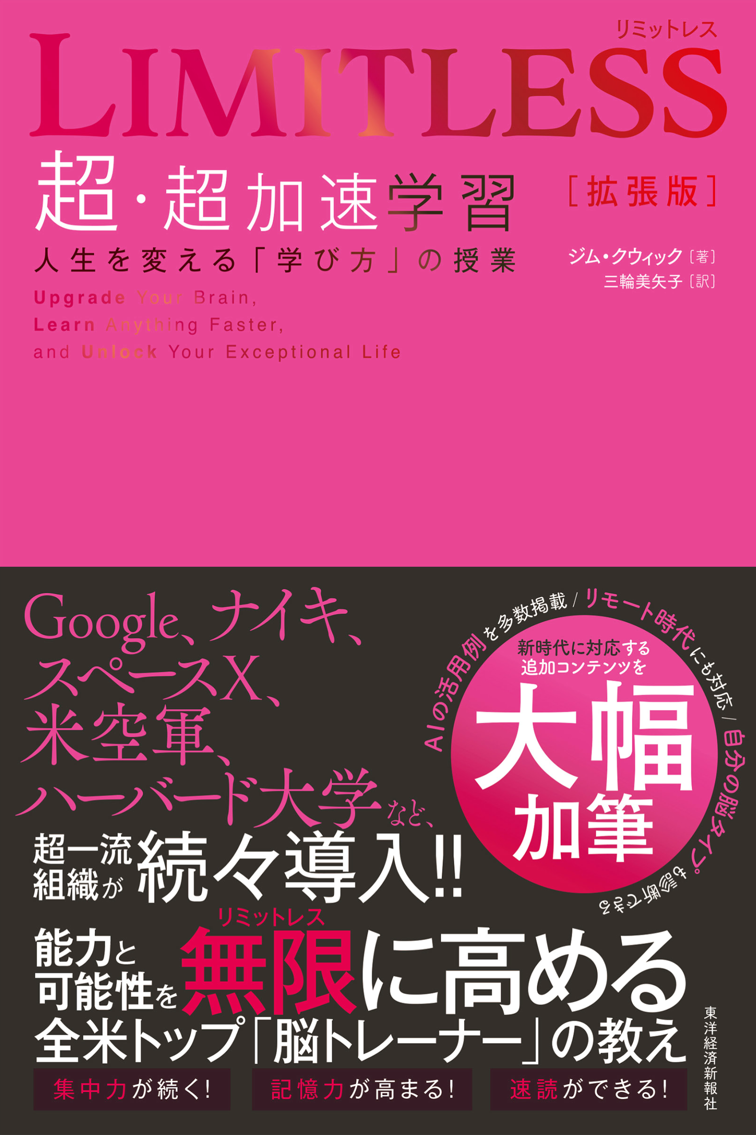 集中力が続く。記憶力が高まる。速読ができる。能力と可能性を無限に高める全米トップトレーナーの勉強法、『Limitless(リミットレス)超加速学習 超加速学習』が大幅加筆の[拡張版]として帰ってきた!AIの活用例、自分の「脳タイプ」診断、リモート時代の学び方など、新時代に対応するコンテンツを追加!