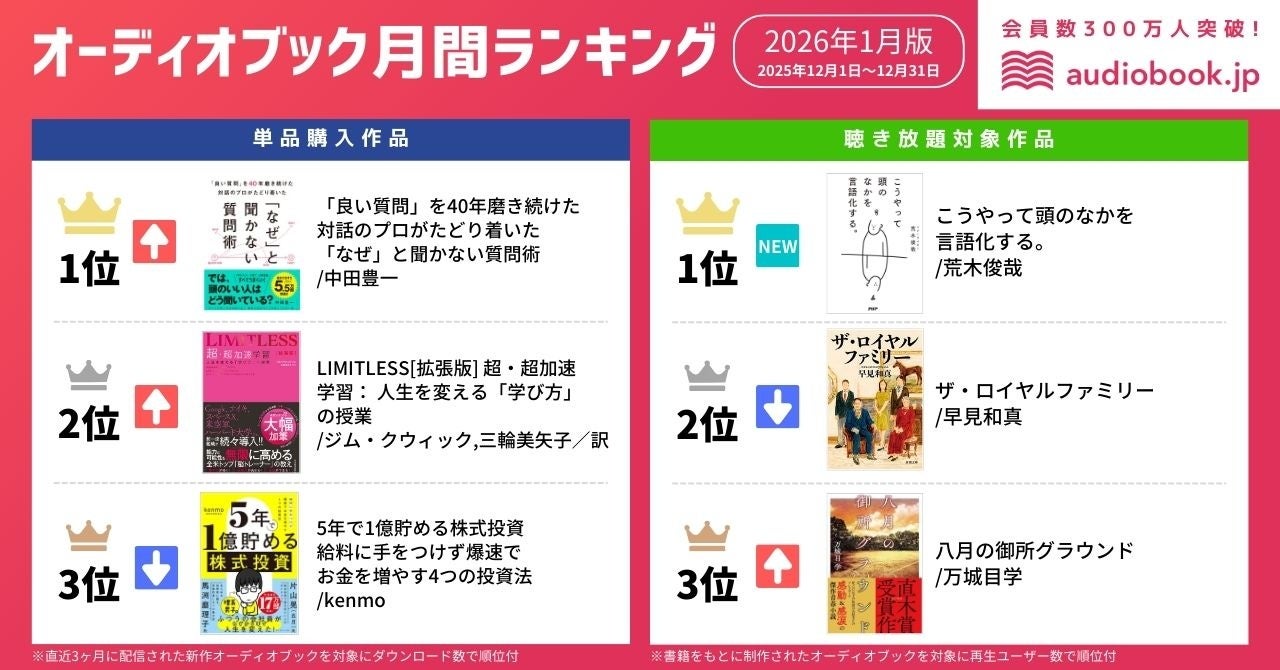 株式会社オトバンク( 本社:東京都文京区、代表取締役社長:久保田裕也、以下「オトバンク」)は、当社が運営する会員数300万人超、オーディオブック書籍ラインナップ数No.1(※1)のオーディオブック配信サービス「audiobook.jp」における、オーディオブック月間ランキング1月付(2025/12/1~12/31)を発表します。