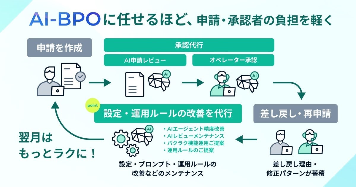 また、AIによる自動チェックと専門オペレーターの確認を組み合わせた「AI-BPO」の運用により、申請時点でミスが事前検知され、申請者や承認者の差し戻し業務も削減します。