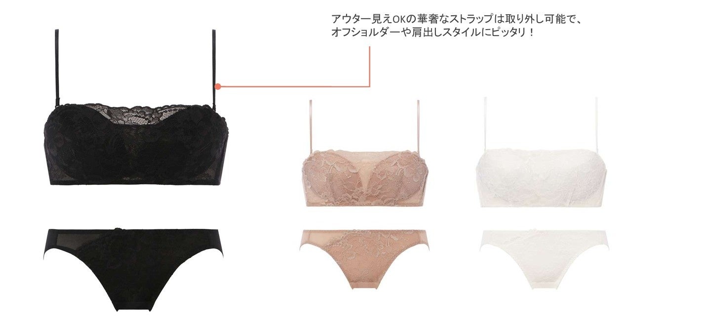 シンプルで美しい花柄編みレースのストラップレスブラ。華奢なストラップは取り外しが可能で、アウターのデザインに合わせて着こなしを楽しめます。着回し力抜群のブラック、ホワイト、ピンクベージュの3色展開です。
