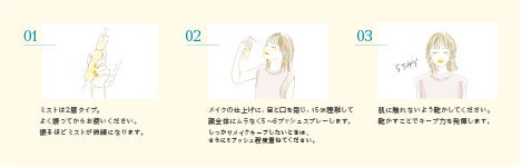 ①2層タイプのミストを、よく振ってからお使いください。しっかり振ることで、ミストの効果を最大限に発揮させることができます。