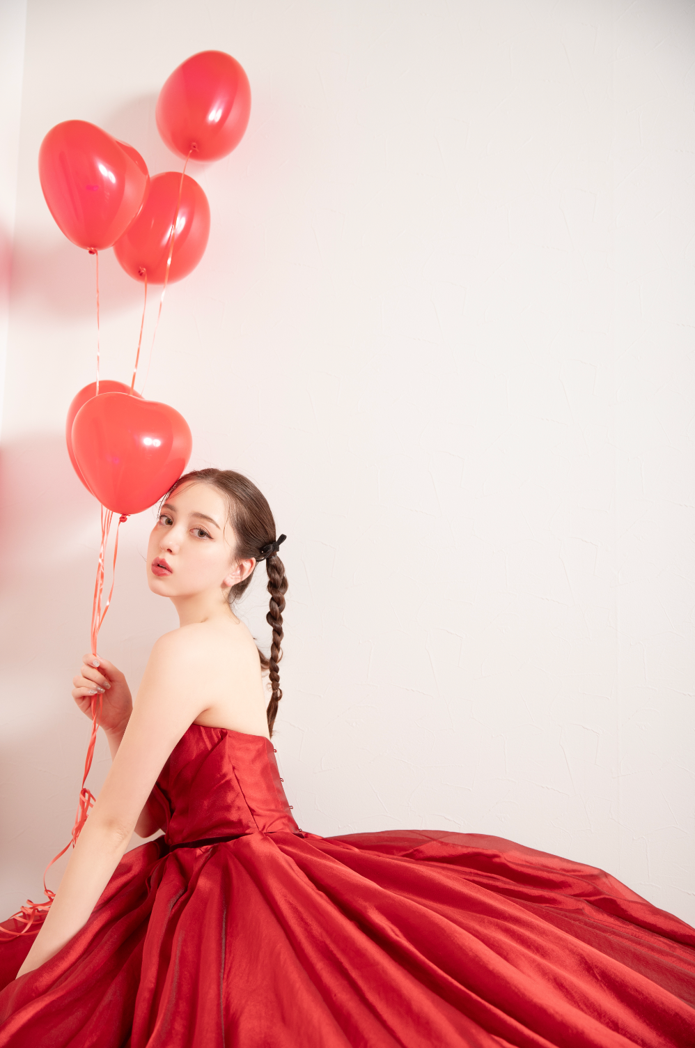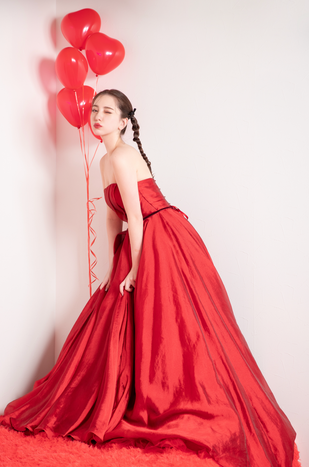 ドレスは白の背景に映えるよう赤をセレクト。白と赤のコントラストが一際目を惹きます。
