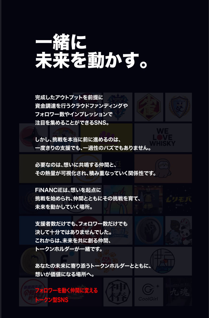 FiNANCiEは、こうした「共感と継続」を原動力とする新しい挑戦と仲間づくりの場を提供します。単なる支援者やフォロワーではなく、未来を共に創る仲間=トークンホルダーとともに歩むことで、挑戦が継続的に成長し、想いが価値へと変わっていきます。私たちが目指すのは、挑戦する人と支える人が一体となり、共に未来を動かしていける場所、その進化の先にあるのがFiNANCiEの第二章です。