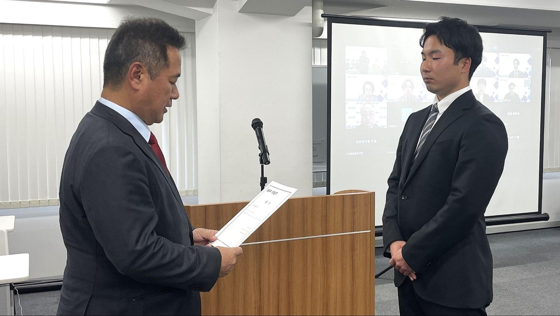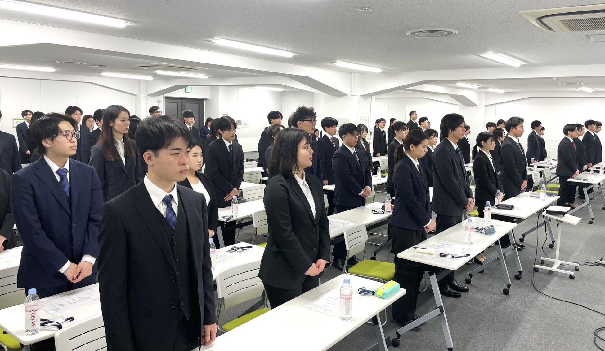 入社式では、代表取締役 渡邉をはじめ当社役員による祝辞が述べられ、新入社員のこれからの成長に期待を寄せました。また、新入社員代表挨拶では、これまで支えてくれた方々への感謝とともに、これからの希望を胸に、初心を忘れず何事にも真剣に取り組む決意が述べられました。