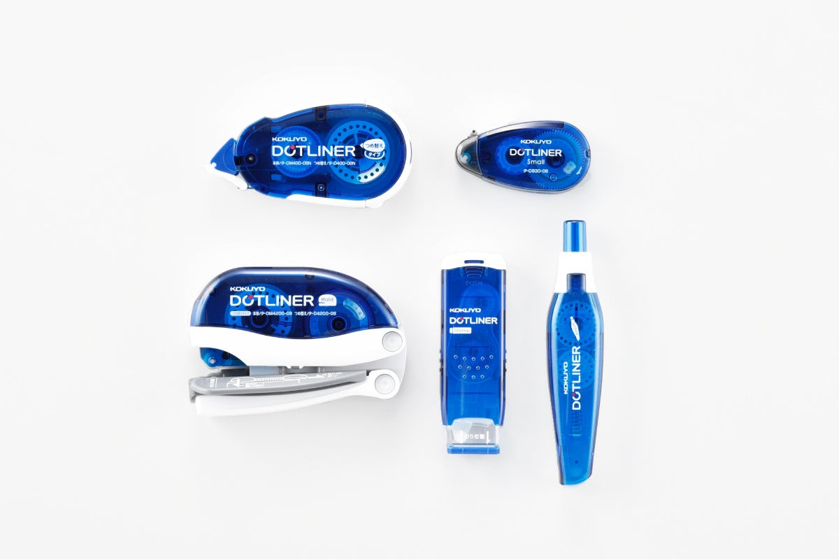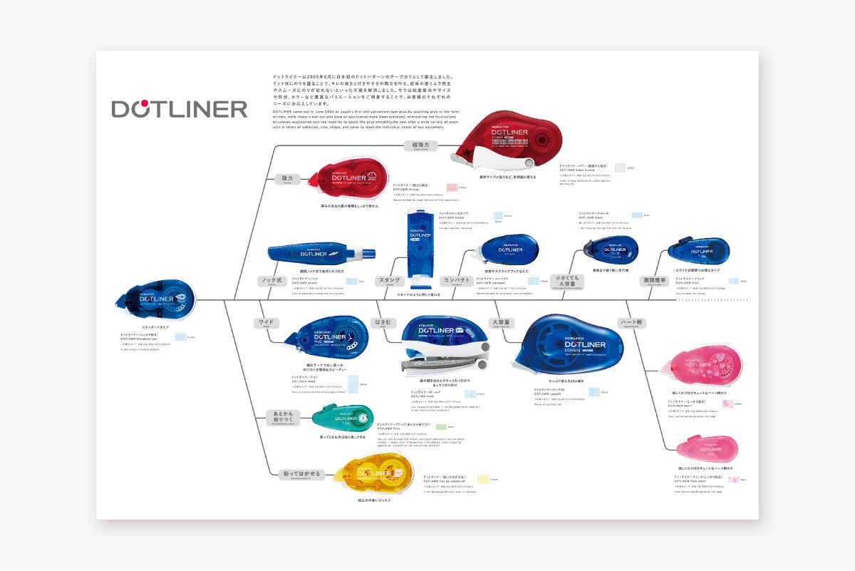 用途に応じて多様な進化を遂げてきたテープのり「ドットライナー」の違いを堪能できるセット。進化の過程とラインナップがわかる図解ポスター付き。