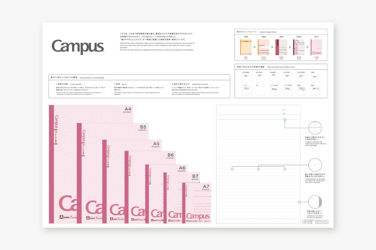 A7サイズからB6サイズまでのキャンパスノートや、キャンパスノートのために作られた修正テープとふせんのセット。キャンパスノートのこだわりが詰まった図解ポスター付き。