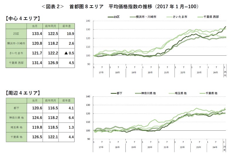 なお、東京23区、神奈川県他、千葉県(西部/他)は2017年1月以降最高額を更新した。4エリア以上が最高額を更新したのは、2023年4月以来22カ月ぶり。