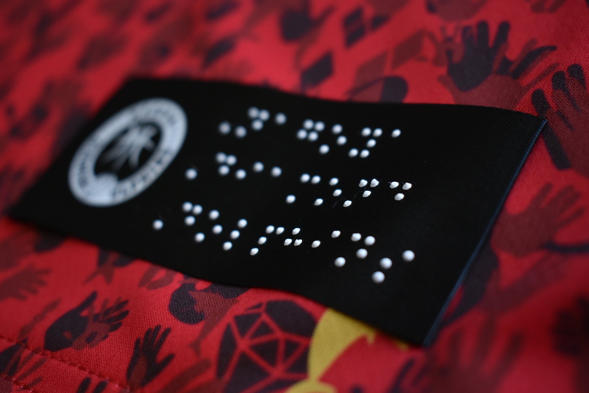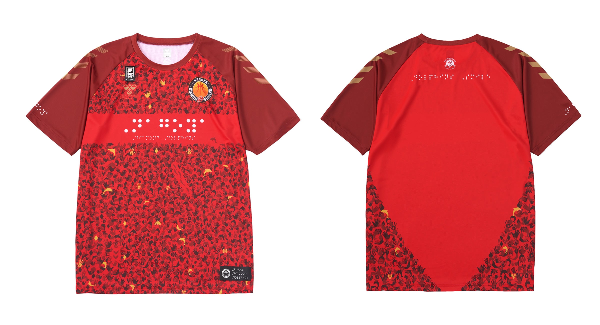 ヒュンメルマッチデイとなった10月28-29日には、選手たちがウォーミングアップなどでこの点字シャツを着用。デザインは、たくさんの応援する手のひらを重ね、アリーナに喜びをつくり出す様子を全面にプリント。クラブのモチーフであるダイヤモンドやイルカを3つの色合いでミックスし、少しずつ形を変えたイラストを組み合わせることで多様性を現し、それぞれが重なり合うことで、地域をドルフィンズレッドの赤に染めていく、夢の実現を目指す姿勢を表しました。
