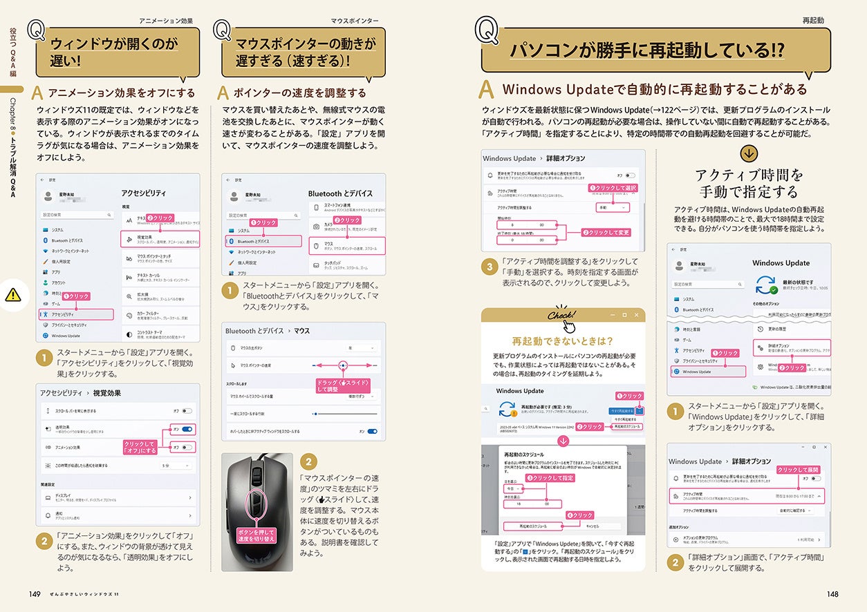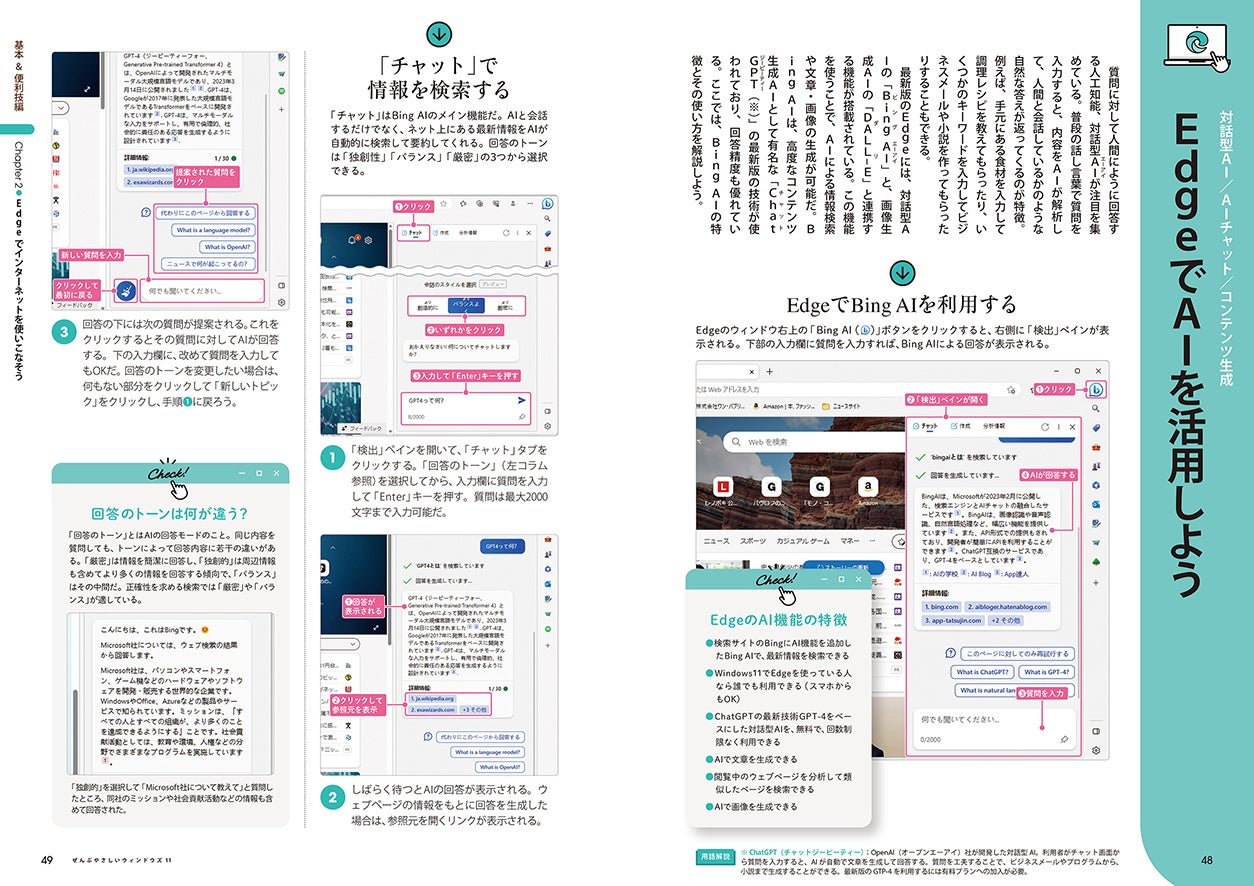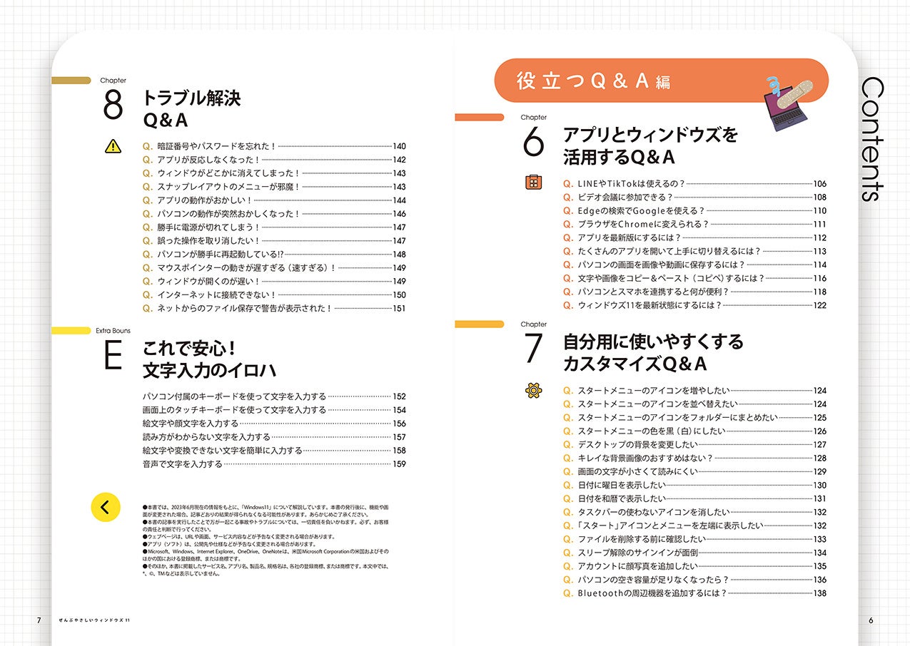 本書は、「基本・便利技」編と「役立つQ&A」編の2部構成になっており、初心者でも迷わずにウィンドウズ11を搭載した最新パソコンの使い方をマスターできます。「基本・便利技」編では各アプリの使い方を順を追って解説。「役立つQ&A」」編では疑問やトラブルに対するアンサーの形で行うべき操作を紹介するなど、操作手順をしっかり習得できます。ウェブブラウザ「Edge」に加わったAI機能をはじめとした最新バージョンの便利機能も網羅した一冊です。