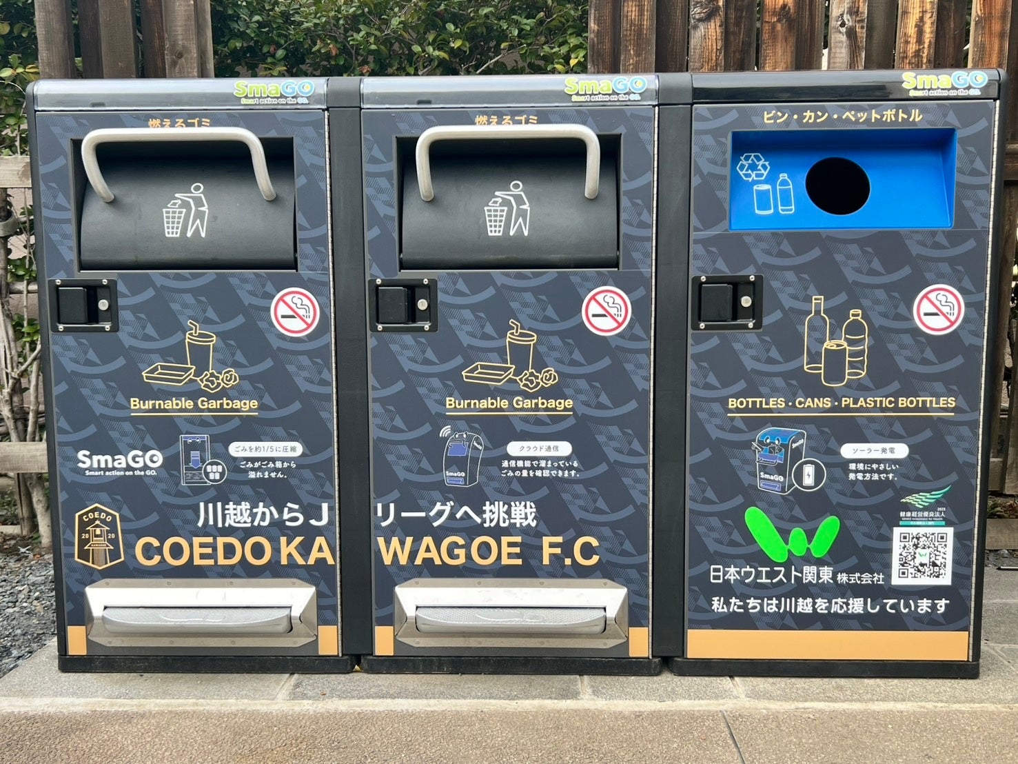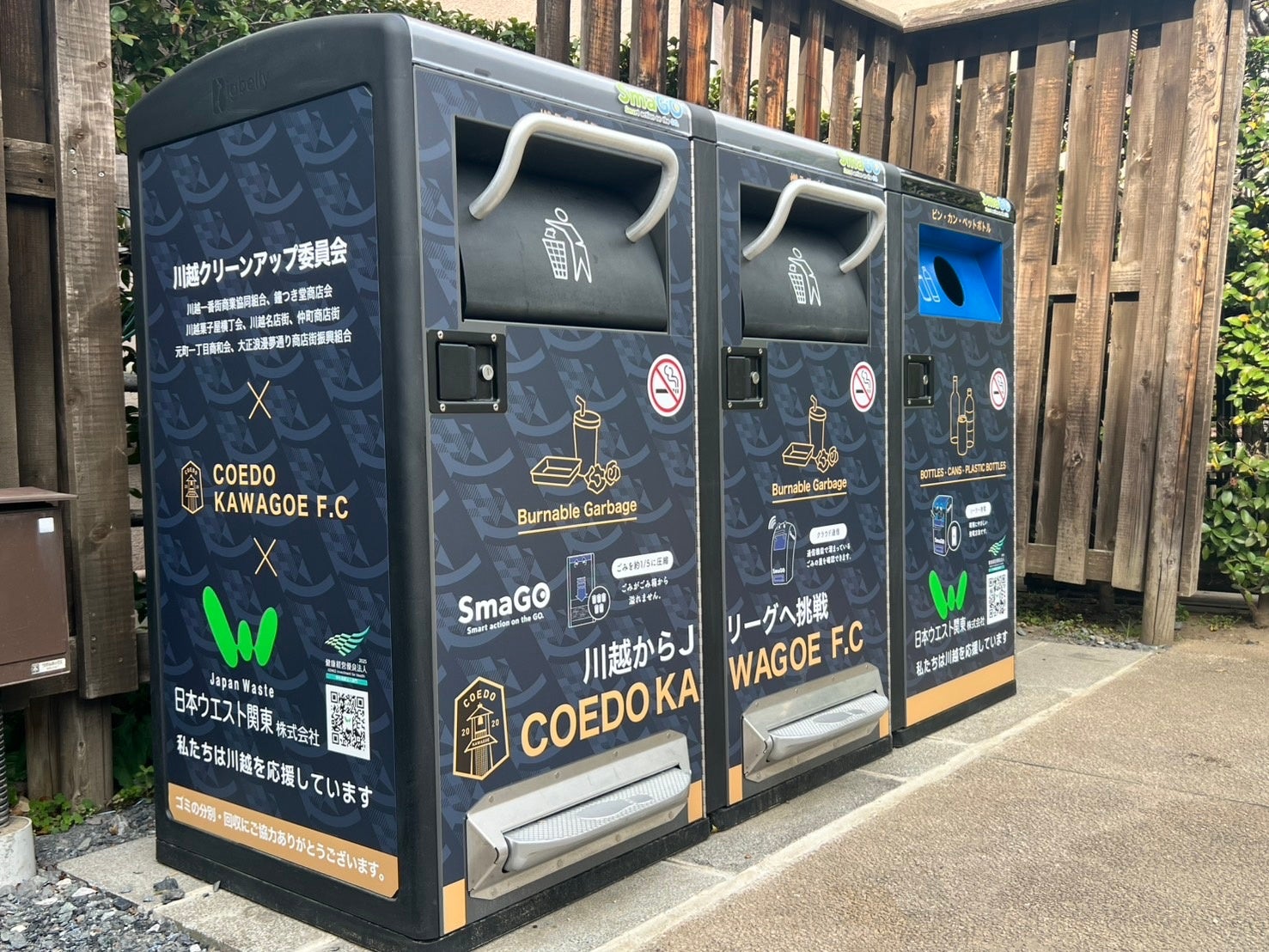 埼玉県川越市の観光中心地である川越一番街商店街の「鍛冶町広場( https://maps.app.goo.gl/28KS8GEVjNdqe9BF9 )」に、埼玉県川越市からJリーグを目指すCOEDO KAWAGOE F.C(所在:埼玉県川越市、代表取締役:有田 和生)とパートナー(スポンサー)企業である日本ウエスト関東株式会社(所在:埼玉県川越市、代表取締役:長田 和志)の協賛/協力で、3台のIoTスマートゴミ箱「SmaGO」が設置された。