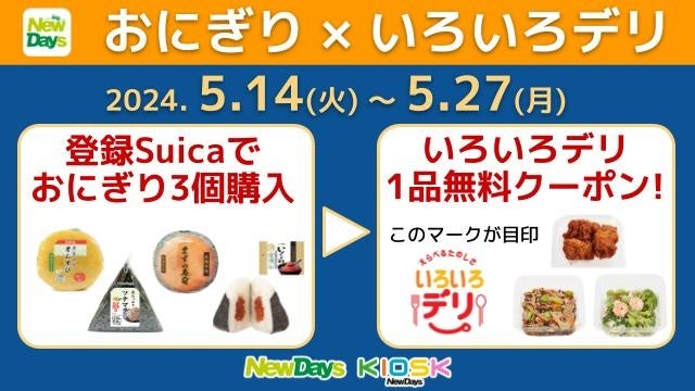 5月14日(火)~5月27日(月)の期間、NewDaysアプリに登録したSuica・PASMOでおにぎりを1品購入すると、アプリのスタンプが1つ貯まります。スタンプを3個貯めると、おかずに、おつまみに、いろいろなシーンでお楽しみいただけるNewDaysのミニデリカ「いろいろデリ」1品無料クーポンと