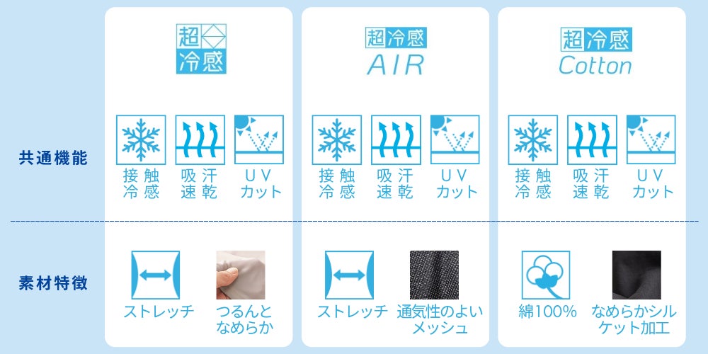 「超冷感」シリーズは、素材違いの3タイプ。定番の「超冷感」は、アイテムバリエが豊富!