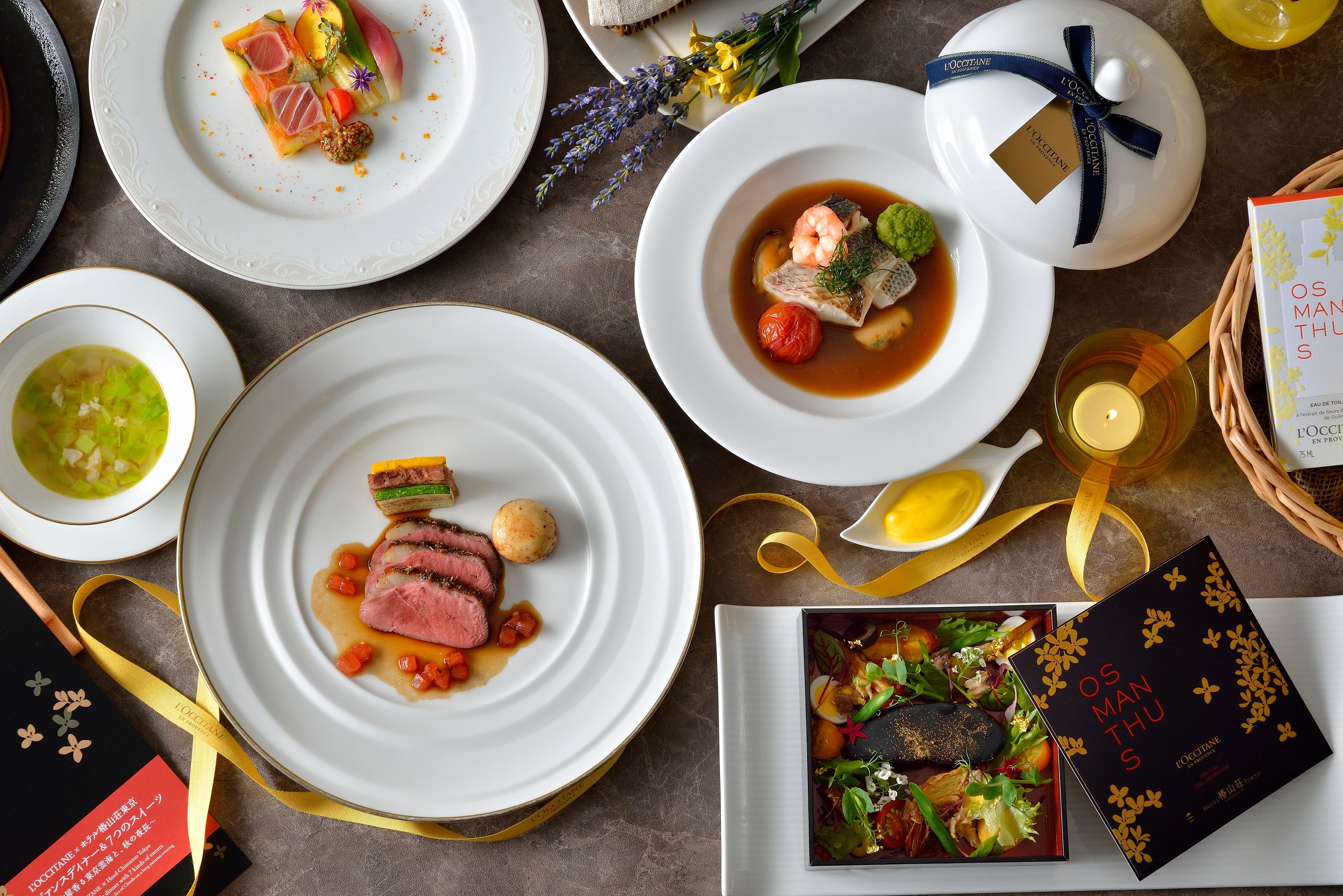 ロクシタン「オスマンサス」の世界観にインスピレーションを受けた、世代の異なる2名の料理人のコラボレーションで生まれたお料理を、昨年よりご好評いただいているフルコースとスイーツビュッフェの形式でご提供いたします。