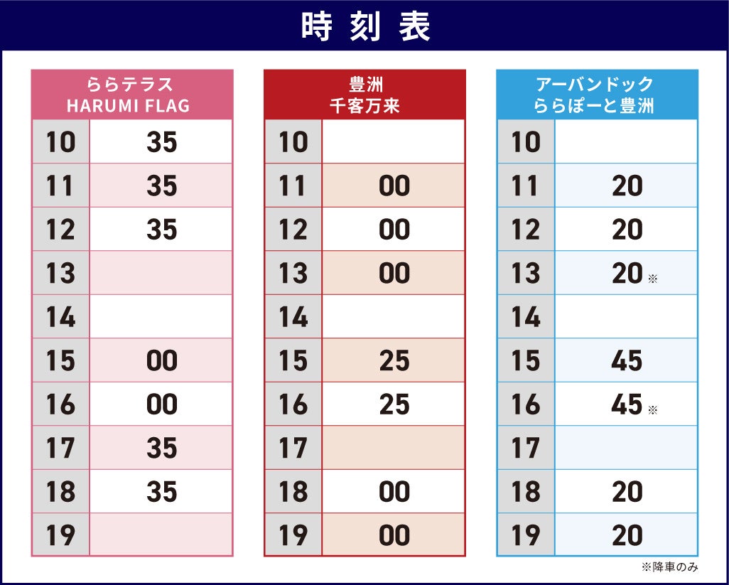 - 無料シャトルバスに乗って アーバンドック ららぽーと豊洲、豊洲 千客万来、ららテラス HARUMI FLAG へ行こう!