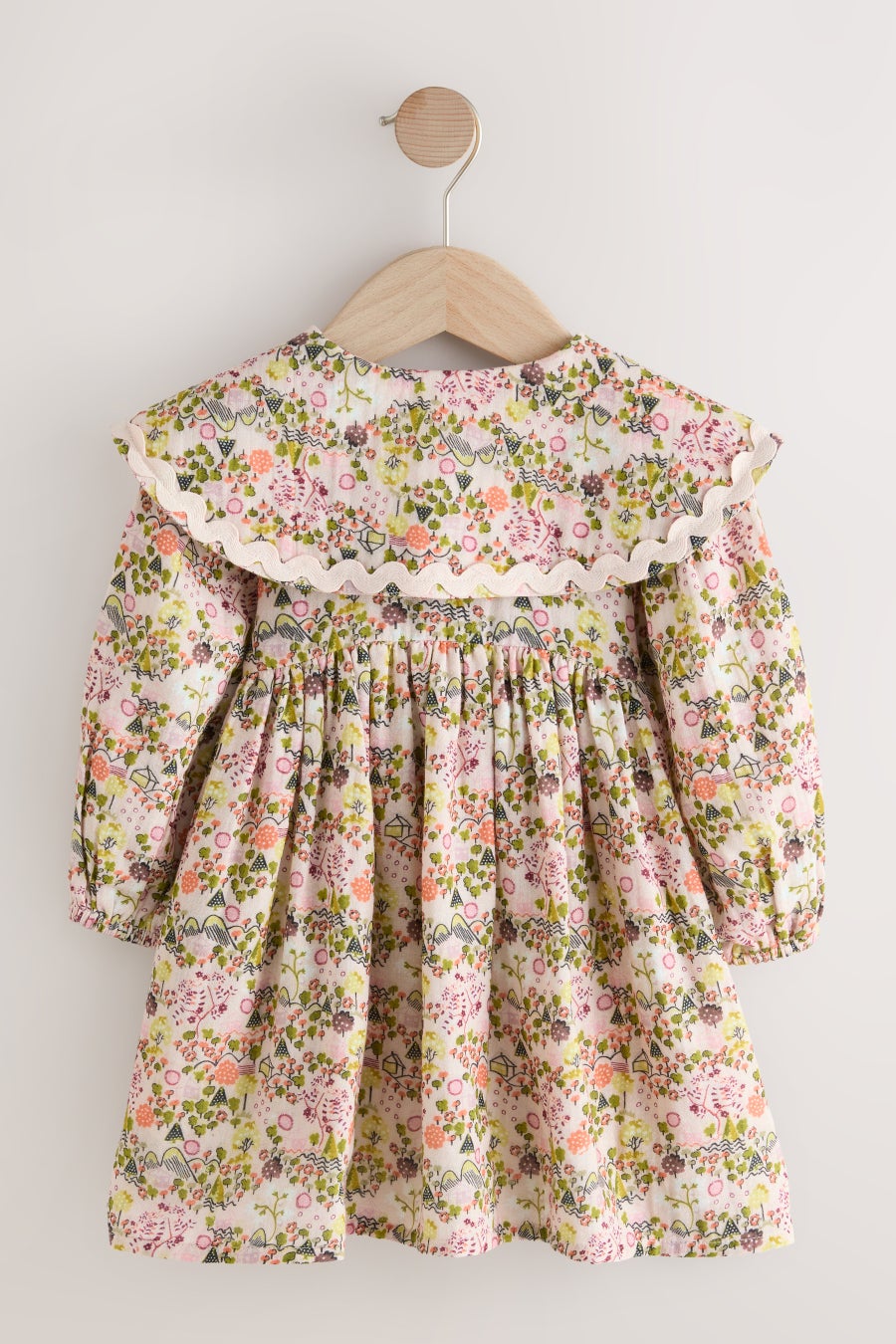 Ditsy Printのロングスリーブワンピースは、フリルのついた襟が可愛らしい、柔らかなコットン素材。淡い色で描かれた白クマと鹿たちがたくさんの花の中で思い思いに過ごしているアートです。