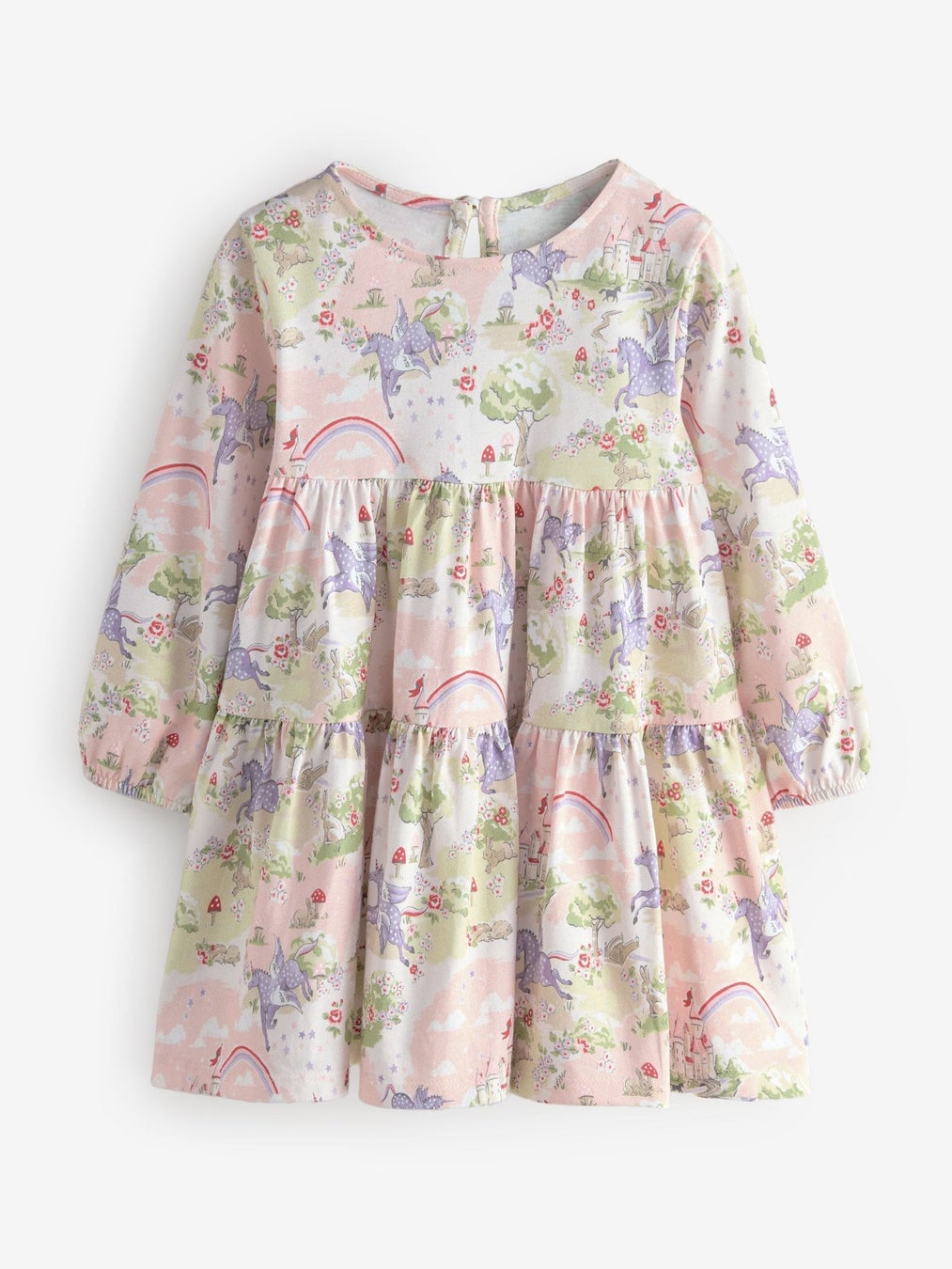 Pink Unicornのアートは、柔らかなコットン製の長袖ティアードドレスに仕立てました。気まぐれな妖精と魔法のユニコーンの住む世界を夢のような繊細なタッチで描いたプリントです。
