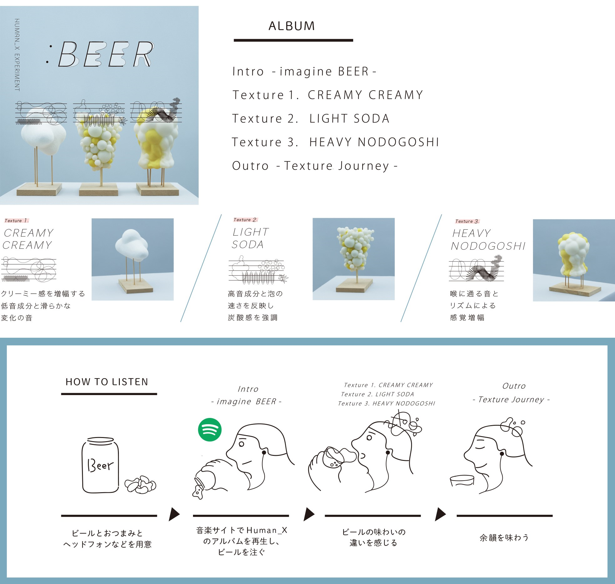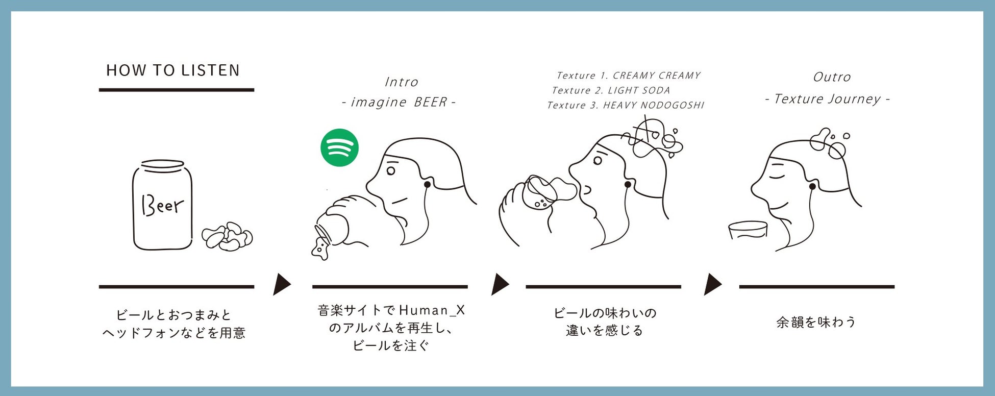 飲む前に聞いて期待感を高めるイントロから、「クリーミー感を増幅する音楽」「炭酸感を強める音楽」「のどごし感を増幅する音楽」と、一連の楽曲を聞きながらビールを味わうことで、時間の経過も含めた新たなおいしさを体験することができます。