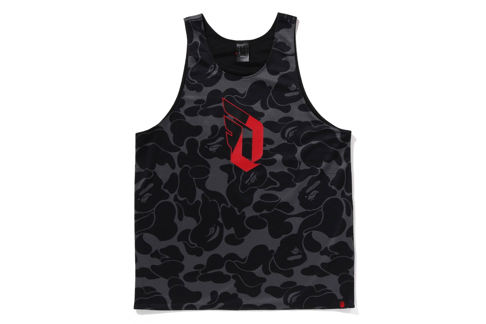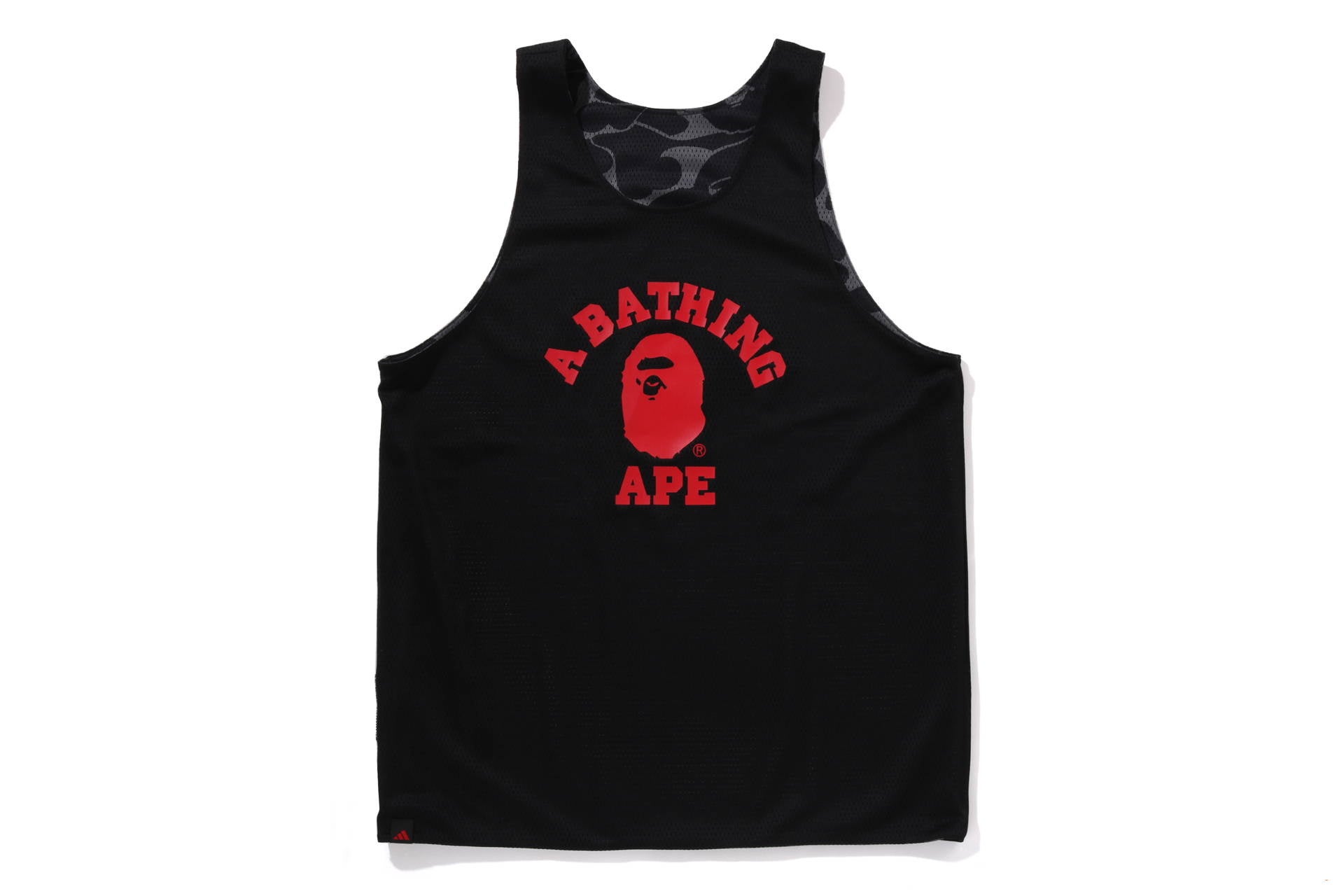 ブラックのSOLID CAMO リバーシブルジャージーは、DAMEロゴを表側に大胆に配し、裏側には無地のボディにBAPE®のアイコニックなカレッジスタイル グラフィックをあしらいました。