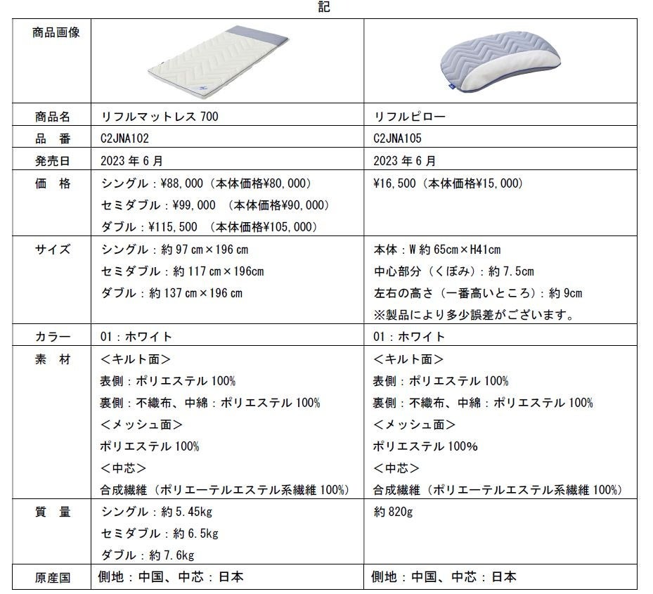 「リフルマットレス700」は、6つのゾーン分けによる体圧分散性や高い通気性が特長の、丸洗い可能な寝具です。硬さの違う高反発網状素材「リフル」を組み合わせ、上層部は柔らかくフィット、下層部はしっかりと支える3層構造になっています。それにより寝心地のよさと寝返りのしやすさを実現しました。