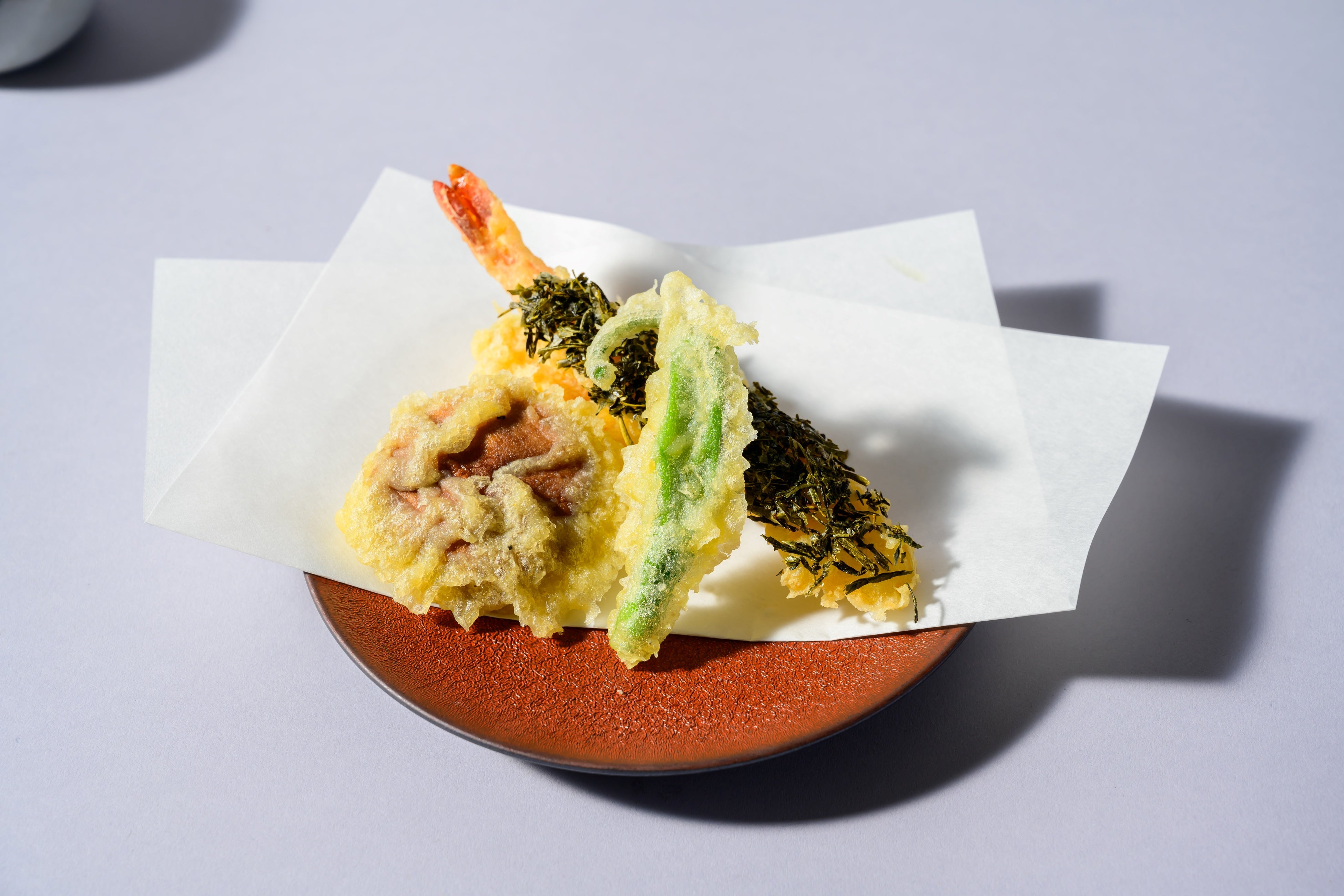 - 揚物 海老と冬野菜 米粉を使った揖斐茶天ぷら
