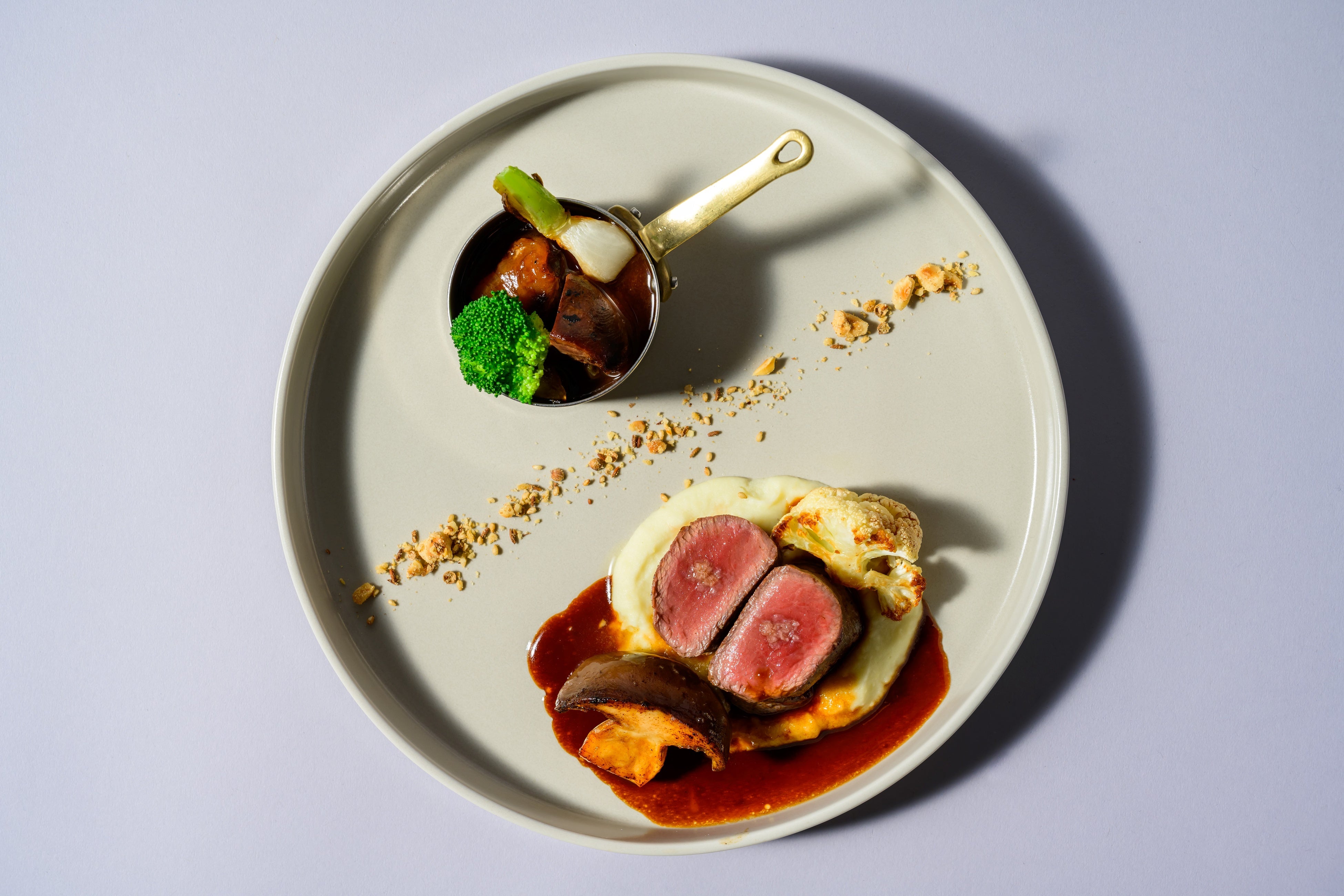 - 焼物 鹿背ロース肉の炭火焼と鹿モモ肉の赤ワイン煮込み 郡上味噌季節の冬野菜