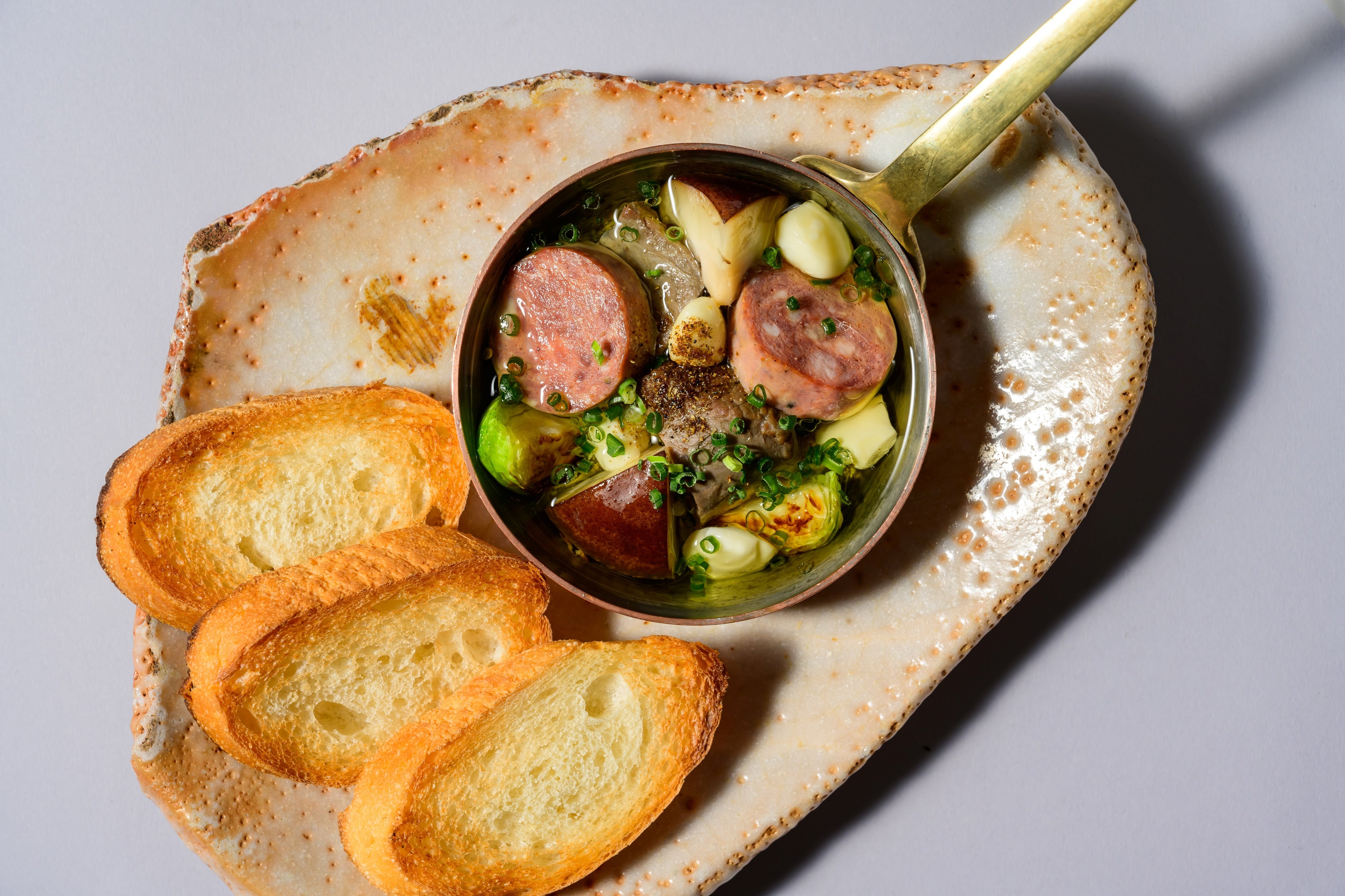 - 鍋 鹿肉スジとジビエソーセージの飛騨山椒オイルアヒージョ