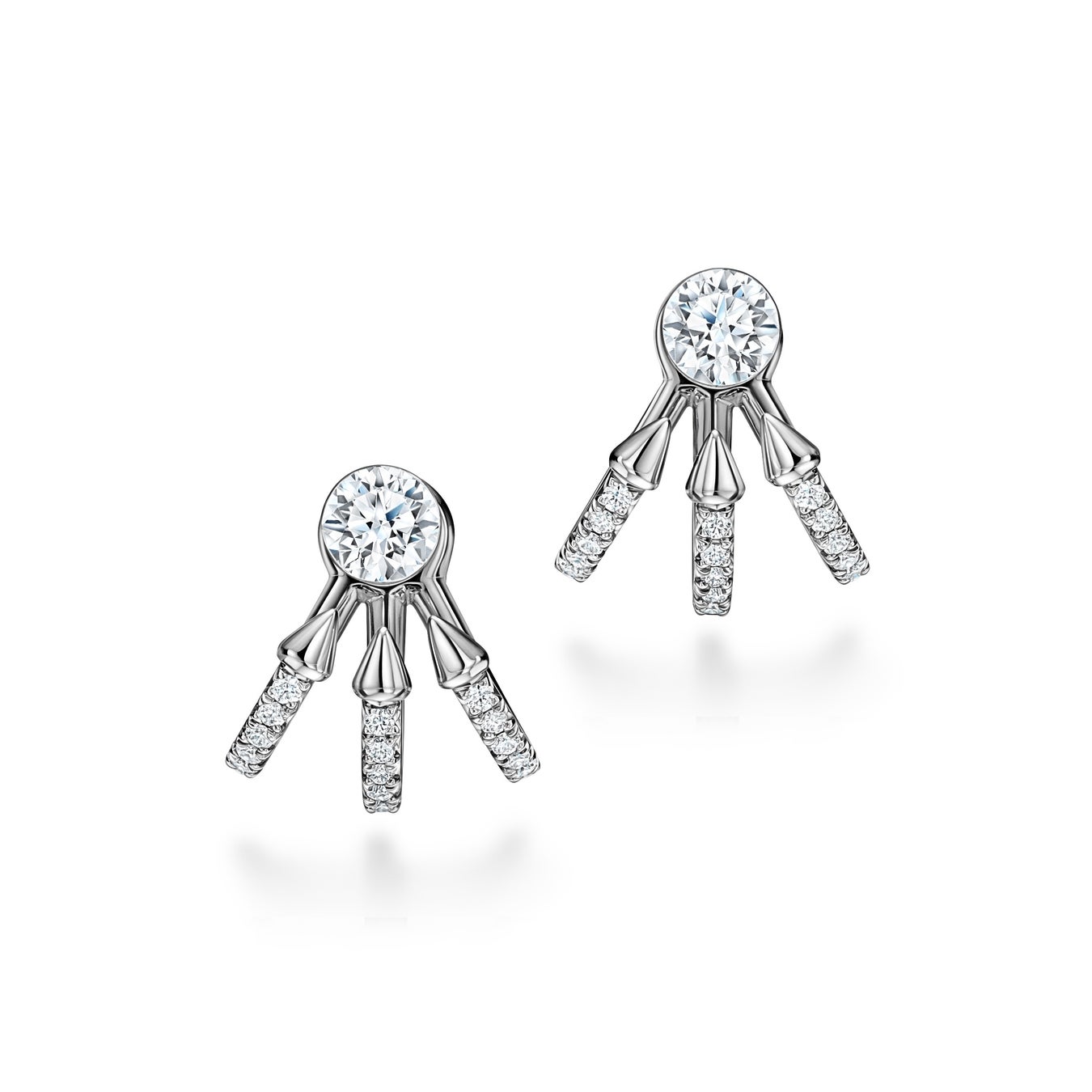 スタッド ピアスは、ダイヤモンドがまるで耳の一部に見えるデザインになっており、ピアスが容易に取り外しできるイヤリング ジャケットのデザインには、3本の槍が施され、センター ダイヤモンドにそれぞれの先端が向いています。フィッシュテール セッティング(繊細な形状の小さなプロングを用いて、宝石を固定するセッティング)されたダイヤモンドは耳元を優しく包み込み、タイタン セッティングをさらに際立たせます。マルチシャンク リングは、